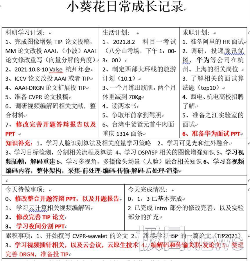 “我在完成一篇论文的时候,已经在写下一篇论文了,同时还在做下下篇论文设想验证。这样时间是连续的,形成一个闭环,中间不会有空窗期。而且还可以及时发现存在的问题,互补优化。”江奎说,他每天都会把所有需要完成的事情按照重要程度排序,细分到每一天的早、中、晚,合理分配在自己的时间记录表里。每天晚上,他会对照时间表进行总结,查找遗留问题,并记录一些自己的想法。
