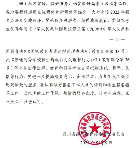 2021年9月14日,四川省高等教育招生考试委员分发布“关于做好我省2022年普通高考报名工作的通知”,就2022年统考、高考事宜进行了说明。详情如下: