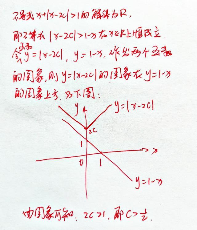 由x+|x-2c|>1得:|x-2c|>1-x,然后设构造两个函数,y=|x-2c|和y=1-x,此时原不等式就转化为两个函数大小的比较。接下来先作出函数y=1-x的图像,因为|x-2c|>1-x,即函数y=|x-2c|的图像始终在函数y=1-x的图像的上方,由此即可求出c的取值范围。