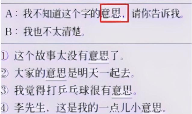 “意思”这个词,可以有多种意思。选项中的四个“意思”,需要细细琢磨才能分辨出来。一个代表兴趣、一个代表想法:一个表示有趣,一个表示心意。