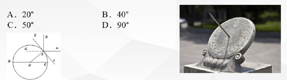 举例2:日晷(gui)是中国古代用来测定时间的仪器,利用与晷面垂直的晷针投射到晷面的影子来测定时间.把地球看成一个球(球心记为O),地球上一点A的纬度是指oA与地球赤道所在平面所成角,点4处的水平面是指过点4且与oA垂直的平面,在点4处放置一个日晷,若晷面与赤道所在平面平行,点4处的纬度为北纬40°,则晷针与点A处的水平面所成角为()