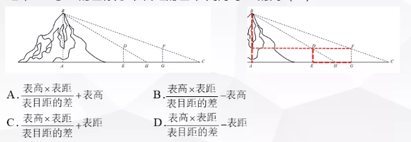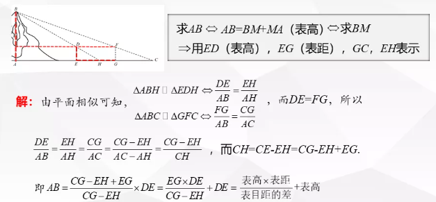 举例3:魏晋时刘徽撰写的《海岛算经》是有关测量的数学著作,其中第一题是测海岛的高.如图,点E,H,G在水平线AC上,DE和FG是两个垂直于水平面且等高的测量标杆的高度,称为“表高”,EG称为“表距”,GC和EH都称为“表目距”,GC与EH的差称为“表目距的差”,则海岛AB的高()