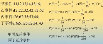 举例1:有6个相同的球,分别标有数字1,2,3,4,5,6,从中有放回的随机取两次,每次取1个球.甲表示事件“第一次取出的球的数字是1”,乙表示事件“第二次取出的球的数字是2”,丙表示事件“两次取出的球的数字之和是8”,丁表示事件“两次取出的球的数字之和是7”,则。