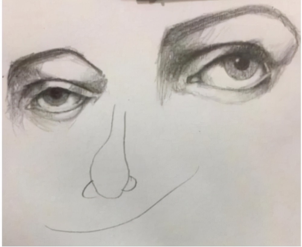 于是,作品中,眼睛部分虽然不算精致,却也看得过去。而鼻子与嘴巴线条可谓极其潦草,让人看都不忍看。阅卷老师看到这幅作品时,唯一的点评就是:不忍直视!