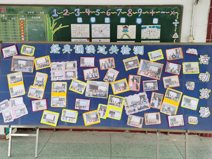 活动前期,语文科组给每个班级制定好本学期的吟诵篇目,包括课内诗词及课外名篇。在日常教学中,语文教师落实吟诵教学并定时定量给学生布置吟诵作业,各班自行进行阶段性考核,从而真正让学生习得吟诵技巧。一学期下来,大部分学生获得了自主吟诵学习的能力。活动当天,为达到良好的检测效果,同年级语文老师到各班进行交叉检测,老师先给学生清楚讲解检测要求:以小组为单位,根据教师出示的篇目,先背诵后吟诵,声音响亮清晰、并且准确把握诗词感情。对于表现优异的学生,老师现场颁发奖状及奖品,并在各班选出5名学生获得“小小吟诵家”的称号。活动结束后,为了进一步促进学生积极参与到吟诵和经典名篇的学习中,安阜小学语文科组群策群力,制作了精美的活动展板,学生在围观中寻找自己的身影,获得了自信、提高了兴趣。