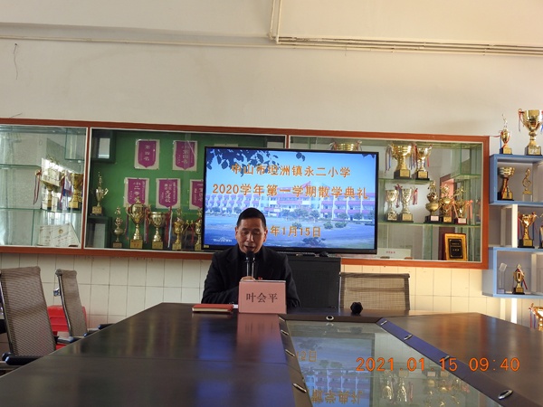 然后,校长叶会平作散学典礼讲话。叶校长带领全体师生回顾本学期学校所做的工作及取得的成绩。2020学年学校恢复到12个班共计569位学生,28位教师。在党委政府的关心支持下,2020年学校新建了科学室、改造了教学楼花基、扩建接送区雨棚、安装了智慧安防系统、新开辟了学校通往镇区的道路。这些硬件建设的完成,极大地改善了学校的办学环境,为同学们营造出更好的学习环境,吃水不忘挖井人,同学们要感谢上级党委政府的关心与支持。本学期,通过全体师生的努力,学校顺利完成了本学期的教育教学任务并取得了优异成绩:师生参赛成绩喜人,教学质量全面提升。学校教育工作取得了良好开局,为学年教育工作的全面胜利奠定了坚实基础。在安全方面,接着,叶校长向全体学生提出了三方面安全方面要求:一是要求同学们假期间做好交通、人身、财产、用水用电用气等安全工作,时刻警惕,杜绝安全事故的出现。二是珍惜生命、敬畏生命,树立生命第一意识,在寒假期间要尽一切努力保护自己的人身安全;三是学会预防性侵。校长告诫学生自己的隐私部位不容他人触碰,也不能去触碰别人的隐私部位。不要单独与他人在一个密蔽场所,遇到他人侵犯自己的隐私要大胆正确地保护自己。最后,校长向全体学生提出三方面寒假特别要求:一是加强疫情防控工作,尽量留在广东省内过年,不要去疫情风险中高等级以上地区,不要参加人员众多的聚集活动,外出尽量不搭公共交通并戴上口罩,尽量避免与陌生人近距离交谈,与人保持1米以上距离。二是寒假在家期间不得玩手机;三是完成学校布置的学习任务:开展课外阅读、学做家务、加强体育锻炼、开展下学期的预习工作。
