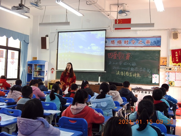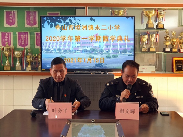 2021年1月15日上午,坦洲镇永二小学举行了期末散学礼暨法制安全教育讲座活动。校长叶会平,法制副校长温文辉出席了这次活动。