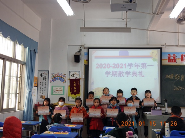 最后,学校给在这个学期学习表现优秀及在期末测试中取得成绩的同学们颁发奖状。当各班同学在班级听取班主任及科任老师布置的寒假作业及注意事项后,带着满满的收获,开开心心地进入愉快的寒假了。