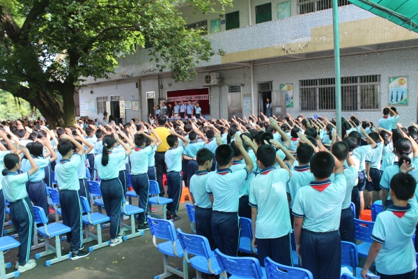 7月5日上午,坦洲镇前进小学全体师生齐聚在榕树头广场,举行散学典礼。永前派出所梁润添、梁伟俊警官,校长郭炳森、教导主任麦丽飞、总务主任古俭恒、优秀学生代表罗曼妮、刘浩恒等列席参加了本次散学礼。