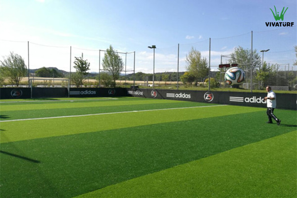 单纯说免填充人造足球草坪,其实并不能替代填充了颗粒的传统人造草,因此必须要增加减震垫的环节。VIVATURF免填充足球草坪系统正是这样一个由免填充人造足球草坪+减震垫所组成的一个完整的制成品,可以直接铺装使用。