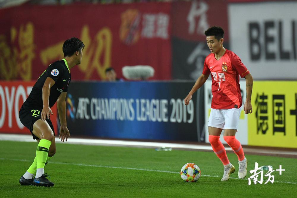 韦世豪面对防守球员,准备突破。本场比赛,韦世豪所在的恒大左路相当活跃,多次制造攻势。