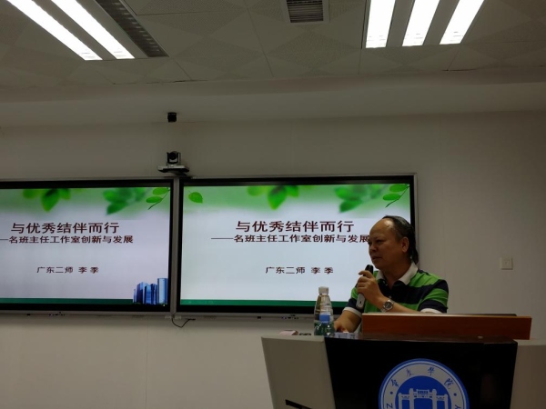 开班典礼结束后,广东未来教育研究院李季教授为大家作“与优秀结伴而行——名班主任工作室创新与发展”专题讲座。李季教授指出,班主任工作是有迷惑与困惑的,德育是由概念到观念再到信念的过程,这是个内生外化的过程,其效果具有滞后性,需要与时俱进,探索德育过程需要尽心尽力,愿大家拥有太阳,如此才能播洒阳光。他指出,班主任专业发展生长点应有四个关注点,“专业能力是幸福,班主任智慧资源”、“心里同龄人是快乐班主任专业素养”、“研究意识是智慧型班主任成长之路”、“专业技能是智慧型班主任看家本领”。李教授跟大家分享班主任工作室的创建方法,他指出,能力大赛是班主任工作室创新第一生长点,作为工作室成员,既是参赛者,又是管理者,还是研究者,三角色融合有利于个人与团队发展;家校共育是班主任工作室创新的第二点,I+We=Fully,I,即为你要在群体中才能发挥最大的优势。成长导向是为唤醒学生的希望,让学生自己对自己充满信心。在分析成长导向问题时,李教授提到木桶原理与教练技术。并举“提供一个镜子,让自己发现并改正问题”例子,引导参加培训的老师在面对“差生”时如何做心理分析,以何种姿态对待优中差生。德育是个漫长的过程,老师身为班级领头羊应该学会当一个有意思的班主任,真正喜欢与投入德育工作。