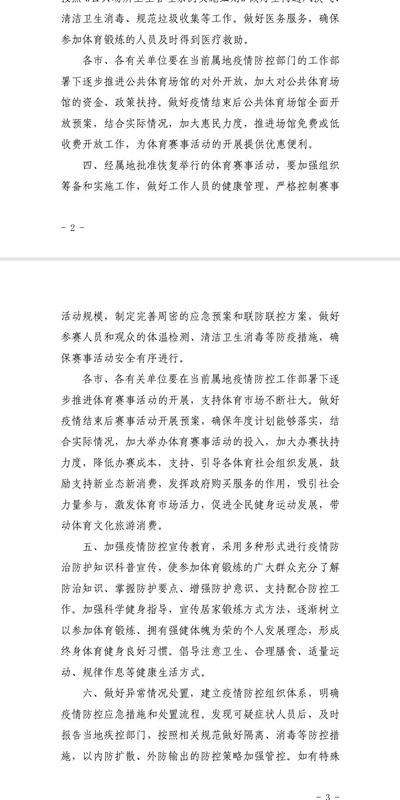 “通知”同时指出,在场馆开放、赛事举办的恢复工作中,要坚持疫情防控优先,明确防控责任,经属地批准恢复开放的公共体育场馆和经属地批准恢复举行的体育赛事活动,都要加强各项防控工作,做好登记管理、监测体温、限流等工作。