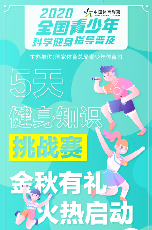 来了!由国家体育总局青少年体育司主办,国家体育总局体育科学研究院承办,广东原动力信息科技有限责任公司执行的“2020年全国青少年科学健身指导普及——5天健身知识挑战赛”国庆正式启动!陪你度过一个有意义的黄金假期!