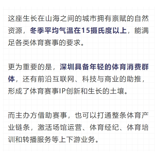 缘何越来越多的高端体育赛事落户深圳?在业内人士看来,深圳有着独天独厚的优势: