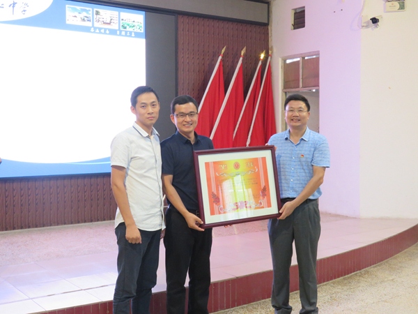 吴祥明校长给高三年级部颁发了“突出贡献年级部”荣誉证书,王友福副主任和汪保源副主任代表领奖。
