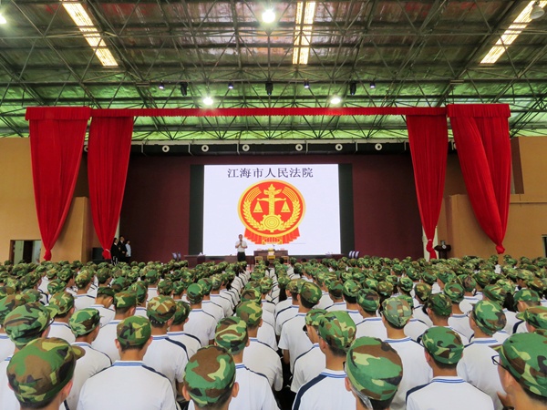 近日,中山二中2019级高一新生军训在这骄阳似火的夏末秋初如期开展。“请全体起立,下面宣读法庭纪律……请审判长、审判员入庭……",随着一声清脆的法槌声,在高一年级1000多位学生殷切目光的翘首期盼下,一场关于青少年早恋、校园欺凌相关的模拟庭审在体育馆拉开帷幕。