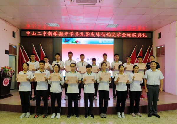 金秋九月,五谷芳香。秋天是收获季,意味着丰收。硕果累累的2019高考刚过去,新的学年又将开启。9月2日上午7时40分,中山市第二中学2019-2020学年开学典礼暨尖峰荷韵奖学金颁奖典礼在学校阶梯室举行,表彰过去一年获得优异成绩的二中学子。典礼由梁红妹副校长主持,吴祥明校长、王曙东副校长、陈福生副校长、侯志坚副校长及部分获奖同学的家长出席典礼。