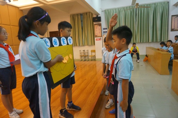为积极响应中山市教研室关于开展中小学“爱国”德育主题班(队团)课教学活动的号召,中山市沙溪镇虎逊小学四(2)中队于2019年10月24日下午开展了以“社会主义核心价值观”之“爱国”——学榜样,爱祖国为主题的队课。在何溥彦辅导员的指导下,四(2)中队的队员们分小组筹划了这次的中队活动。当天下午,黄金奇校长还召集全校的青年辅导员来参加了此次四(2)中队的队活动。