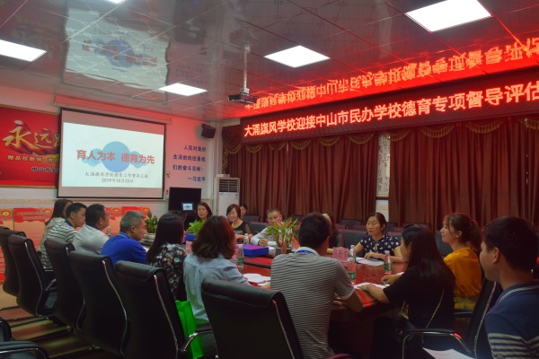 2019年10月23日下午,中山市南区教育指导中心及南区民办学校的德育主任组成的督导评估小组莅临中山市大涌旗风学校进行督导评估,由大涌镇教育事务指导中心民办教育专干郑凯旋、德育专干萧若瑜、以及大涌旗风学校严丙武常务校长、叶莉主任、小学部蔡金艳校长、初中部章荣发校长、小学部罗柳德育副校长、初中部杨江鸣德育主任及各行政的陪同下进行素质教育督导评估检查。