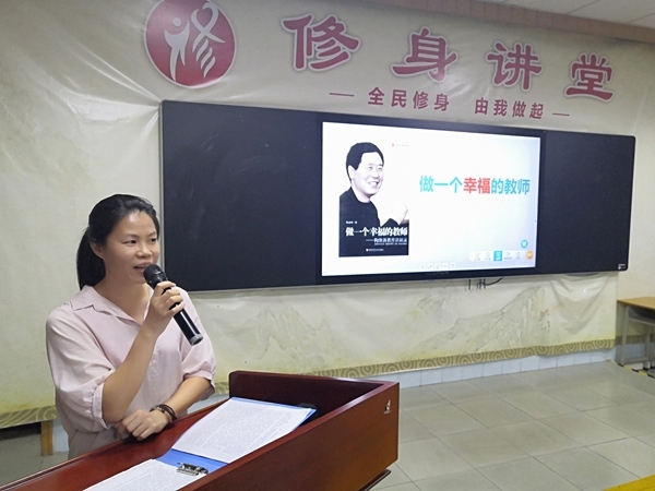 分享会由黄淑华老师拉开序幕,黄老师分享的是陶继新的《做一个幸福的教师》。陶继新老师以其独特的人格魅力、渊博的知识、丰厚的文学素养、诗化的语言、丰富翔实的资料以及对教育的一种忧患意识,深刻地阐述了读书教学相得益彰,以及读书对教师发展和学生成长的重要影响,使老师们走向终生幸福的文化之旅。黄老师阅读过后,感悟深刻,最后说:“做一个幸福的教师,用温热的心灵交融稚嫩的心灵,文化素养也许就是滋润心灵的甘醇。”