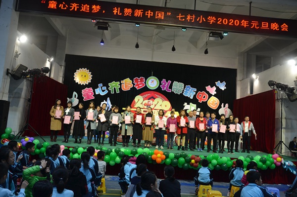 迎元旦佳节,展学子风采。在2020年即将到来之际,七村小学在2019年12月31日晚上7点,举行“童心齐追梦.礼赞新中国”迎2020年元旦文艺晚会。出席本次晚会的嘉宾有镇教育事务指导中心徐小情女士、七村社区居委会委员汤秋霞女士、七村幼儿园园长韦玉妹女士。