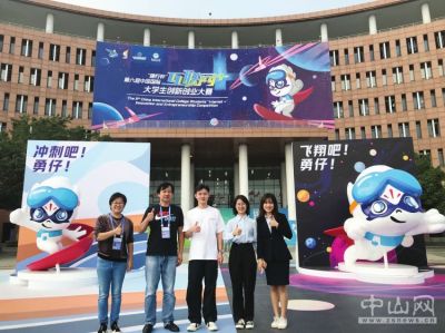 中山职院学生参加第六届中国国际“互联网+”大学生创新创业大赛总决赛时留影,左二为指导老师马鹏常。 受访者 供图