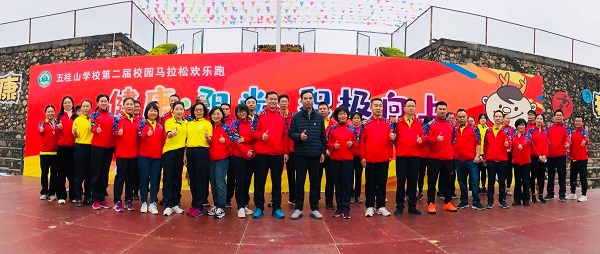12月25日上午,五桂山学校校园内红旗飘飘,口号声、加油声响彻云霄,到处洋溢着快乐的节日气氛,这是以“健康·阳光 积极向上”为题的第二届“校园马拉松欢乐跑”开跑啦!