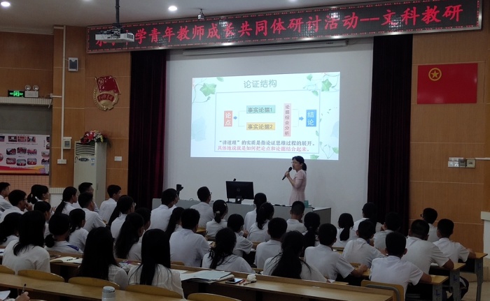 活动第一项:听课。与会老师观摩由语文科组丘彦老师带来的优质研讨课:《议论文专题----论证结构》。首先,丘老师根据学生自评和老师估测对学生进行了青铜组、白银组和黄金组的分层,明确了初级、中级和高级三层教学目标,并检查了课前布置的分层预习作业。然后,丘老师紧扣议论文结构的基本主线,即论点--事实论据--结论,采用了分层的文本、分层的活动和分层的训练,由基本结构到较复杂的变式,逐层递进,攻破难点,将分层教学具体落实到各个教学环节之中。最后,丘老师对学生进行了堂上分层检测,并对学生进行了分层评价,整节课丘彦老师思维缜密,和蔼亲切,与学生轻松互动,课堂气氛非常活跃,学生检测反馈效果较好。