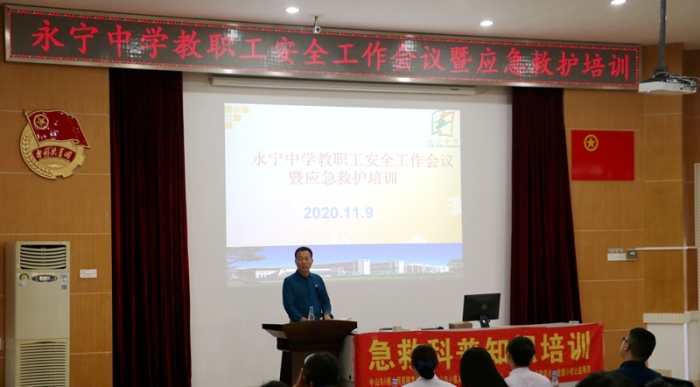 为切实加强学校的安全工作,提高全校师生的安全素养与应急救护能力,共创平安、和谐校园,永宁中学于11月9日“全国消防日”当天,分别举行了全校师生应急疏散演练、消防安全专题教育活动,以及教职工安全工作会议及应急救护培训。为确保活动顺利、高效,学校安全工作领导组提前制定了“疏散演练工作方案”和消防安全专题教育与应急救护培训方案,详细规划了活动程序和人员分工,明确了具体岗位职责要求。