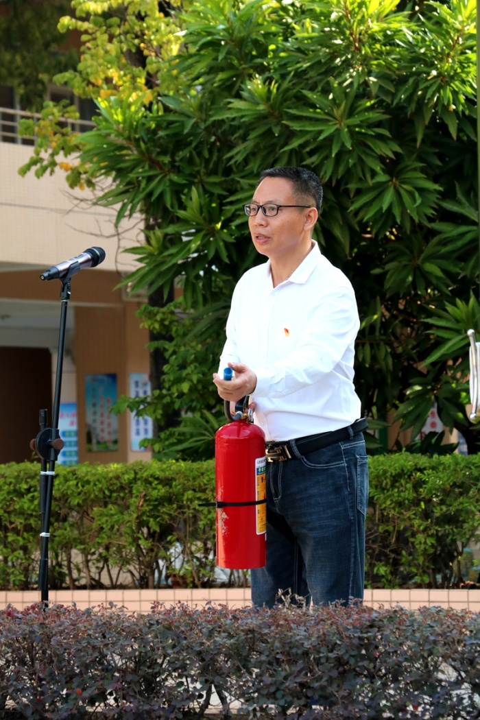 接着,初二(5)班胡婉清同学结合学习、生活实际和周边发生的消防事例做了“关注消防,生命至上”的主题演讲,介绍了家校防止“火灾”发生的六点措施,呼吁全校同学珍爱生命,牢记消防知识,争当“消防”小能手。随后,黄小平主任作了消防安全专题教育动员讲话,提出了校园安全具体要求。并为全校师生概括讲解了干粉灭火器正确使用步骤和操作方法,学校保安员为师生现场展示正确使用灭火器和湿布扑灭火情的全过程。同时,学校将组织召开“消防安全”主题班会、印发“消防安全致家长一封信”、家校联动等宣传教育活动,通过“小手拉大手”活动,将消防安全教育辐射到家庭、社区。