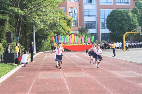 大会开始前,体育科组全体总动员对比赛场地进行精心布置,每个班都全身心投入开幕式节目,别开生面、创意无限的入场式,各班将抗疫精神融入表演当中,充分展示了升平师生的风采和作为中国人的自豪。五星红旗伴随着国歌随风飘扬,冉冉升起,在学生运动员代表和老师裁判代表宣誓后,何德雄校长隆重宣布“2020年升平小学第十一届‘家委杯’运动会开幕”,一瞬间点燃了所有学生心中的运动热情。