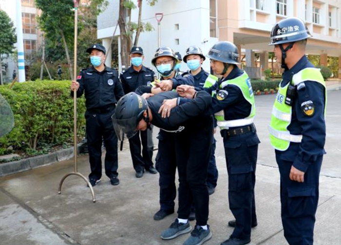 演练前,永宁中学安全领导小组认真制定了“校园反恐防暴”活动方案,演练总指挥陈清茂校长主持召开防暴反恐演练专题部署会,组织相关教职工认真学习了《永宁中学反恐防暴演练活动方案》。 12月28日下午4点,永宁中学组织部分师生开展反恐防暴演练,随着陈清茂校长宣布演习开始,一位老师模拟家长接孩子放学,突然一名由老师扮演的“歹徒”持刀闯入校园,准备“伤害”该学生及家长。学校2名值班保安迅速反应,立即启动一键报警系统,手持盾牌、钢叉、警棍拦截“歹徒”。学校安全领导组在接到“危险情况”报告后迅速增援,合力将“歹徒”制服,并通知永宁治保会将“歹徒”带走。整个演练过程组织紧张有序,撤离迅速,效果良好。