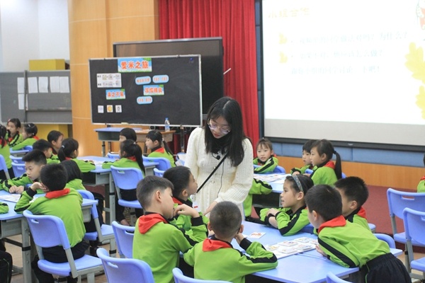 随后,钟勇老师一行来到报告厅,观摩了一节由升平小学青年教师黄思婕老师执教的主题班会课。在孙川老师工作室团队的带领和指导下,黄思婕老师带着二(3)班的孩子共同呈现了一堂以“节约粮食”为主题的班会课。精美的板书、层层递进的教学环节设计、精心设计的互动环节,黄老师带领孩子们一起认识粮食的来之不易,以及如何将珍惜粮食落到实处。整节课气氛活跃、主题鲜明,得到了现场观摩的老师们一致好评。这不仅体现出升平小学青年教师的积极进取,更彰显了广东省名班主任孙川工作室团队积极的辐射带动作用。