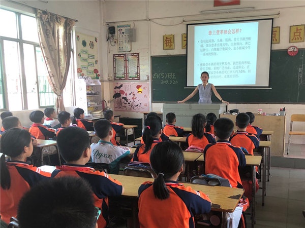 在讲座上,她向大家讲述了登革热的起因:是登革热病毒引起、由蚊传播的一种急性传染病,病人和隐性感染者是主要传染源。临床特征为起病急骤,高热,全身肌肉、骨髓及关节痛,极度疲乏,部分患可有皮疹、出血倾向和淋巴结肿大。随后,她还教育同学们防治登革热的方法,如:清杂物、清杂草、清积水,对饮用水缸要加盖防蚊,勤换水,尽量少在家种植需要特别多积水的植物,注意室内的灭蚊工作,重点区域要进行广泛的药物喷洒。也可以考虑使用物理性的防蚊工具,如防蚊纱窗,防蚊纱门,防蚊纱网等。