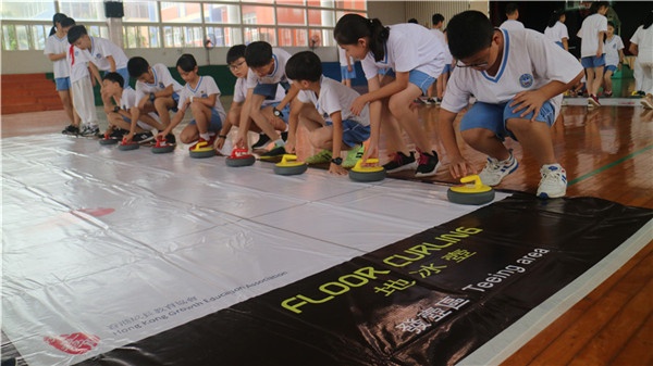 下午第二节课,来自香港成长教育协会的导师们把地冰壶的来历、规则、技巧、正确姿势及评分规则等一一为孩子们耐心讲解,鼓励他们积极体验。在导师的指导下,孩子们认真聆听,了解到地冰壶是一种集运动、竞技和娱乐于一体的运动项目,能充分开发青少年儿童的智力、分析能力、逻辑思考,培养团队合作及领导力,坚持锻炼可增强身体素质等。他们被这项运动深深吸引,并产生了浓厚的兴趣,一起手握球把,单膝跪地,轻轻一推,一板一眼地开始了冰壶运动的学习。