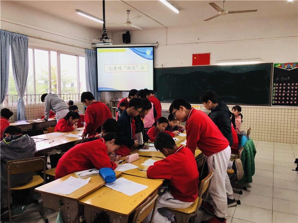 语文是一门实践性很强的课程,作文教学一直是小学语文教学的难点。学生写作能力是在实践中形成的,缺乏写作实践支撑的习作教学注定是低效的。有鉴于此,小榄广源学校省级课题《“快乐作文赶集会”语文活动课程的开发与实施研究》力图改变学生作文交流少、读者单一的问题,以促进学生作文交流和实践为目标,开展多元习作活动,培养学生创新精神和语文实践能力。本周,五年级语文老师在各班开展“快乐作文赶集会——儿童诗淘宝活动”。