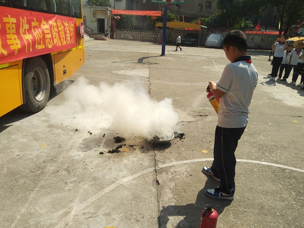 活动由学校负责安全工作的王旷主任主持,他首先讲解了校车运行中易出现的不安全情况,如起火自燃、交通事故等,接着他从安全应急门、安全锤、灭火器的使用方法,突发事故中如何保护自己等方面讲述了突发事件中的逃生技巧,还现场演示了灭火器的使用。最后,由校车司机、护送老师、乘车学生现场模拟了突发事件发生时的逃生过程,在校车发生意外时,教师和司机第一时间打开车门和安全应急门,学生在老师和司机的护送下安全的逃离校车,到远离校车的安全地点集中,整个过程用时不到1分钟,达到了演练的预期效果。