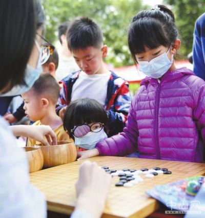 12月13日,东区公益集市活动的围棋摊位前,一名正在进行视力治疗的小女孩专注地看着棋盘。本报记者 余兆宇 摄