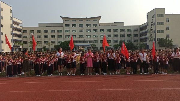 在张馨彤队员的指挥下,全场所有人员进行了唱队歌活动。大队长张若诗带领全体队员重温入队誓词。聚星学校少工委副主任张帅校长和聚星学校大队辅导员谭治伟老师分别进行了队旗下讲话。少工委副主任张帅校长首先给现场全体少先队员致予了节日的问候,随后他告诫所有队员和辅导员们,要不忘初心,牢记使命,今天幸福美好的生活是前辈用鲜血和生命换取回来的,要爱护红领巾,爱护队旗,从小立志做个有用之才,长大要投身到祖国需要的地方,去建设国家,去回馈社会。辅导员谭治伟老师则告诉所有队员:少先队经历了70年的风风雨雨,从当年的劳动童子军到今天的少年先锋队,几十年的风雨历程,这个光辉的组织始终跟着中国共产党,与祖国同呼吸,共命运。希望广大少先队员好好学习,好好做人,从讲礼貌、爱护花草、爱护公共物品等小事做起,让鲜艳的红领巾永远飘扬在心中。最后,伴随着“时刻准备着!”呼号声,活动落下了帷幕。