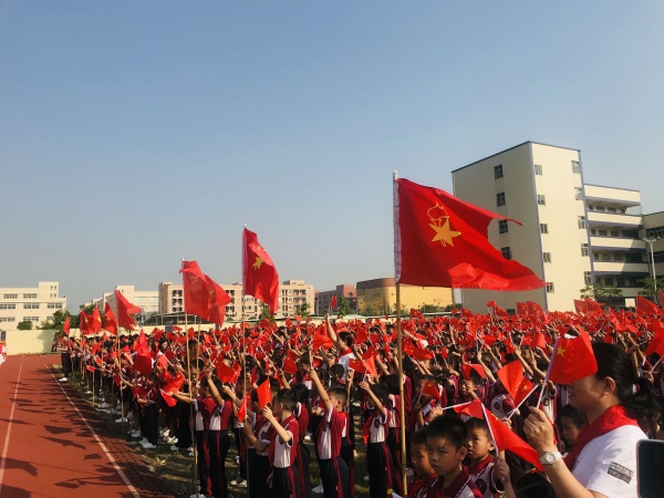 “祖国,我爱你”同学们举起右手,迎着阳光向祖国发出最真挚的呼号。鲜艳的红领巾飘扬在前胸,将爱国热情倾述于心间。