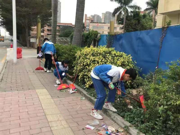 简单培训后,同学们在各小组组长带领下进行了分组活动。第一组和第三组任务是清除学校大门和小门两边花坛的塑料垃圾以及杂草。第二组任务是完成校外共享单车摆放以及校外路边垃圾清扫。同学们充分发挥团结协作精神,个个不怕脏,不怕累,干劲十足,仔细认真打扫每一块区域,彰显了良好的精神面貌。通过辛勤劳动,学校周围环境焕然一新。