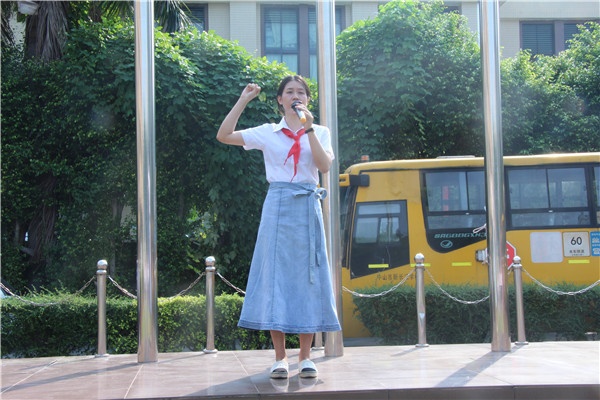 新长江庆祝建队70周年的主题仪式活动在朝气蓬勃的《出旗曲》中拉开了帷幕。三名大队委踏着坚实的步伐出队旗,操场中的少先队员们向队旗敬队礼,整个出旗仪式庄重而严肃。随后七年级二班的大队委林夏锡走上旗台指挥所有少先队员唱队歌。