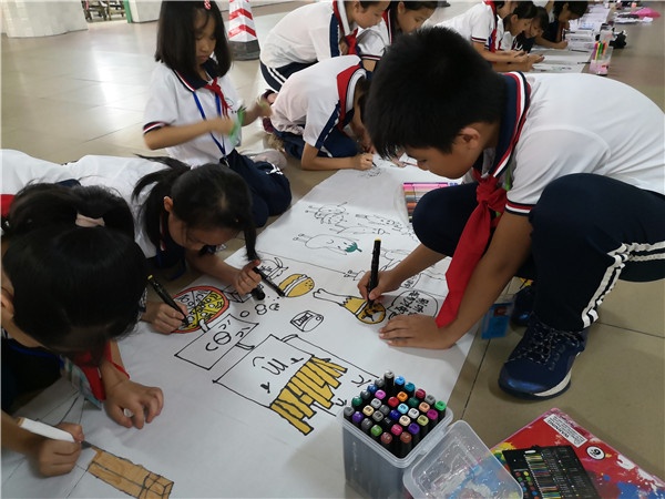 1点40分,活动正式开始,百米长卷一地铺开,170多名小画家或蹲、或趴,或席地而坐,手握五彩的画笔,所画体裁多样,儿童画、油棒画、水彩画、水粉画等都出现在花卷上。他们年纪虽小,但技巧熟练,在勾勒出的框架中开始在画卷上轻描淡写:描绘、调色、渲染,每个步骤一气呵成,色彩使用大胆,层次分明,学生们虽然画姿各异,但是那份认真与专注却又十分统一,快乐的笑容、张扬的姿态,此次活动经历必然成为他们宝贵的回忆。
