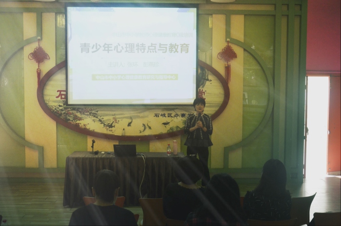 市华侨中学张环老师在《青少年心理特点与教育》主题培训中,引导教师重视和加强对青少年的心理健康教育。
