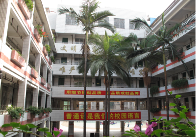 | 环境设施 | 校本部校园建设符合国家要求,学校占地面积6172平方米,校舍建筑面积8147平方米,其中教学辅助用室4635平方米,占总建筑面积57%,生活用房549平方米,占总建筑面积7%,校园绿化面积达1468平方米,占总建筑面积18%。近年来,政府不断加大学校投入,学校环境和教学设施得到明显改善。校园环境优雅设计规划、布局合理,教学区、生活区、运动区分开:教学区有一般教室27个,所有课室均安装风扇、空调。另外设有电脑室、科学实验室、书法室、美术室、图书室、少先队大队部、心理辅导室、卫生室、音乐室、舞蹈室、体育馆等专用室和校园网、红领巾广播网、校园多媒体教学平台、校园安防网、闭路电视等教育平台。图书馆藏书量为31887册,人均26.3本。 校本部运动区场地约4100平方米,其中体育运动场面3100平方米,读书廊250平方米、小花园502平方米、小礼堂250平方米;生活区设有卫生间,冷、热水供应。校门周边整洁,校舍建筑质量经建设部门检测符合国家建设标准。 | ||