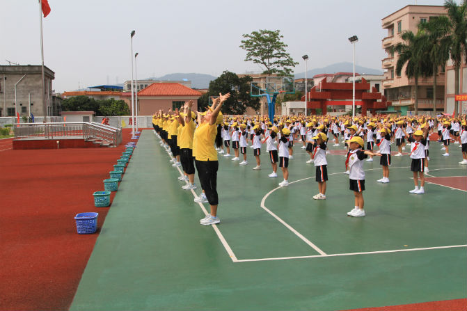 我校以“一切为了学生的健康成长”为宗旨,以学生快乐、健康为目标,全面深入开展体育大课间活动, 鼓励小学生走进阳光、走向操场、走入大自然,积极参加形式多样、生动活泼、健康向上的体育运动。今年6月,为了进一步推动我校体育大间活动深入开展,从而辐射到全镇,我校向全镇公民办中小学展示的体育大课间活动。到场观摩的有镇教育局的全体领导、各小学校校长、主管体育主任、体育老师、部分家长代表等300多人。整齐的动作、明快的节奏赢得了大家的美誉。今年教师节表彰大会上,大迳小学还荣获体育特色学校称号。