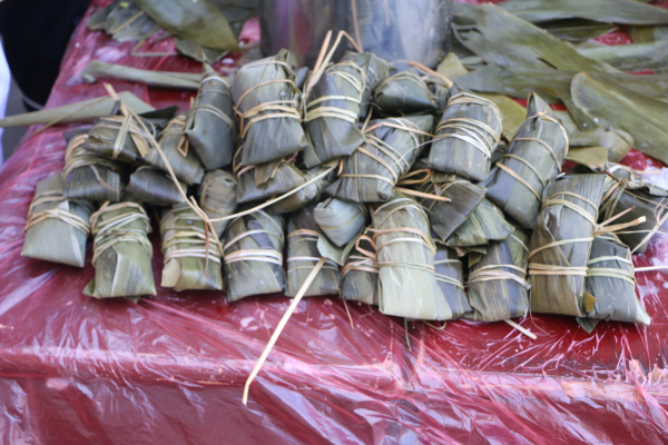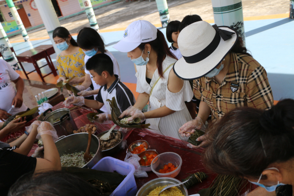 在校园里与学生一起动手裹粽子。家长亲手教学生学习怎么裹粽子,看起来简单的技巧,操作起来也不容易。学生在有序地、满满地操作中感受那种传统习俗,传统文化,为民族文化的传承努力着。虽然裹出来的粽子并没有家长们裹得那么美观,但从实践中感受的却是丰富而快乐!