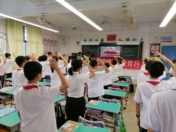 首先,举行了新学期庄严的奏唱国歌仪式,全体师生肃穆而立,奏唱国歌,展现了陈村镇初级中学全体师生昂扬向上、拼搏进取的精神风貌。