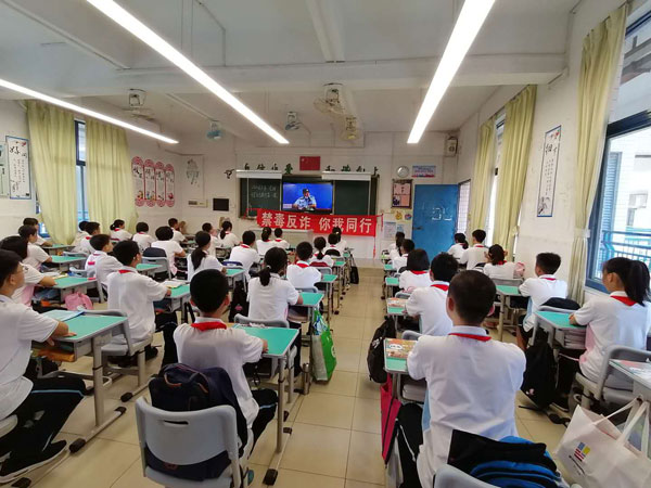 接着,由学校法制(禁毒)副校长陈村旧圩合成警务区卢柱和警长给全体师生上了一堂主题为“禁毒反诈,你我同行”的法制安全教育课。卢柱和警长通过案例,深入浅出的讲解,就“防溺水”、“交通安全”、“禁毒”、“防诈骗”等方面的安全问题和同学们进行了深入交流,他希望全体师生加强安全宣传教育、提高个人思想素质、养成良好习惯、加强自我防范、珍惜时光,从规范做起,从我做起,为争创安全文明校园作出贡献。